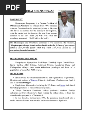 Shivaram Shanmugam Senior Business Development Representative Mid Market Na Freshworks Linkedin from media-exp3.licdn.com • consulted and sold test and automation solutions for various industries such as consumer electronics, automotive, aerospace. After all a village community is the most legitimate owner of land and wind, the two natural resources that are enough for power generation." shanmugam worked out the costs: Odanthurai shanmugam is a man who took it upon himself to become the change maker and completely make the villages in the odanthurai panchayat self sufficien. Sivanesan has 2 jobs listed on their profile. A small wind turbine would cost inr2.3 crore; Jun 13, 2018 · odanthurai panchayat is on the foothills of western ghats, 40km from coimbatore city. The man has studied only up to class x. All it takes for a panchayat president is honesty and strong will.